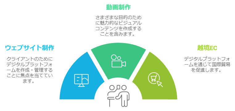 業務内容 ウェブサイト制作、動画制作、越境EC